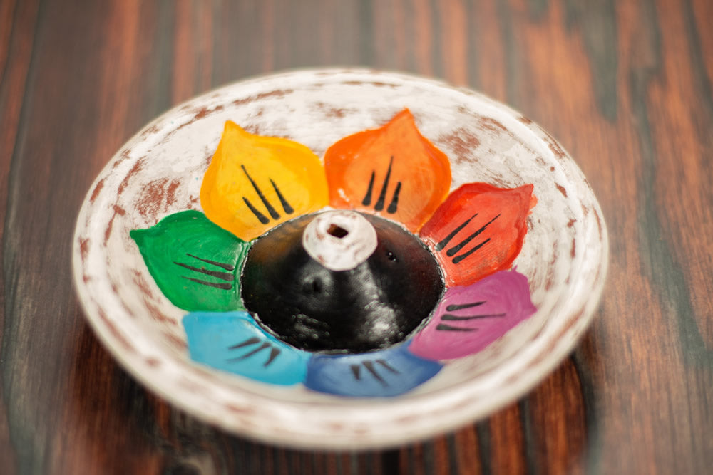 Dieser Räucherstäbchenhalter ist sehr schön mit den Farben der Chakren handbemalt.